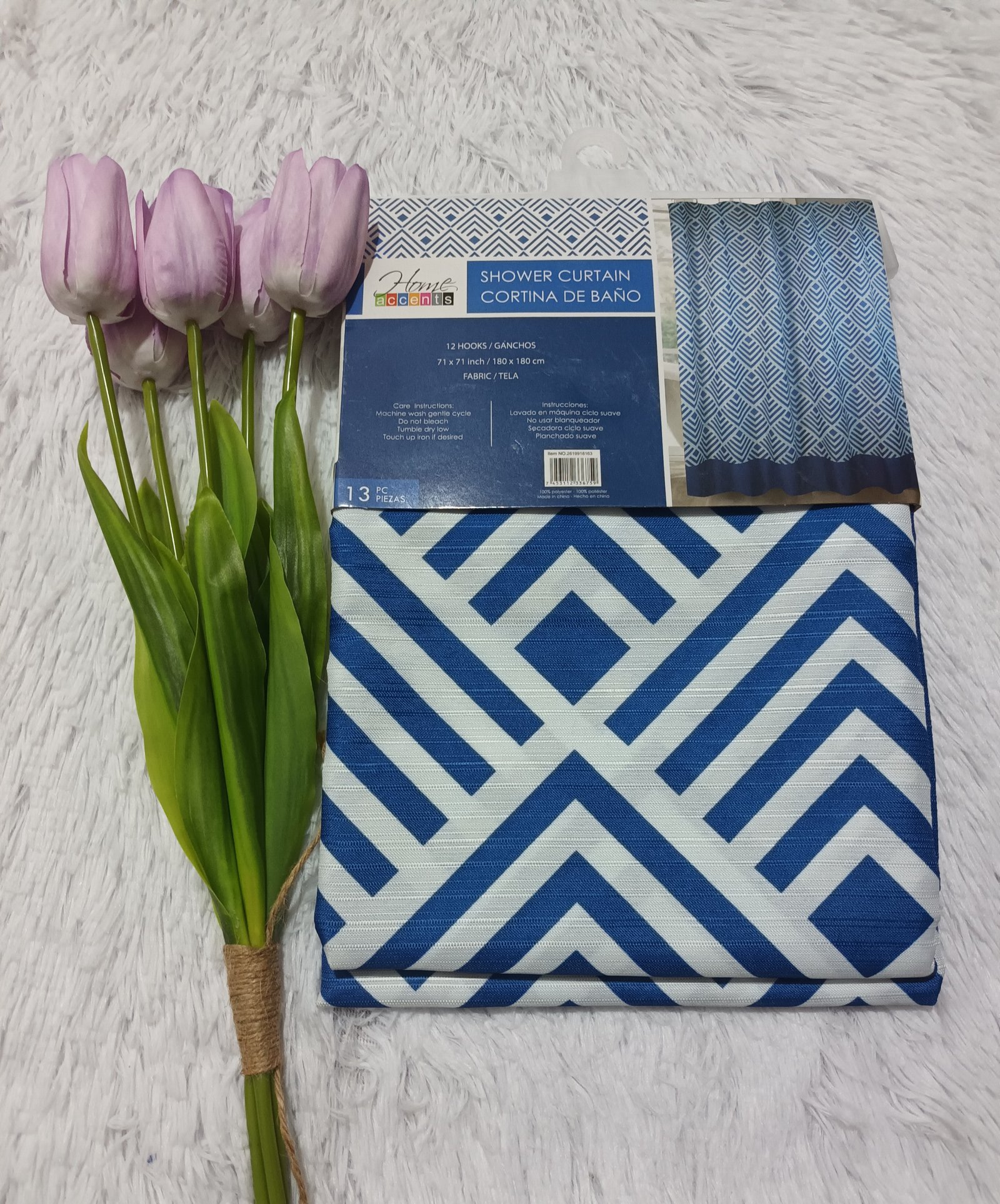 Cortina de baño de Tela con diseño de rombos azules y blancos