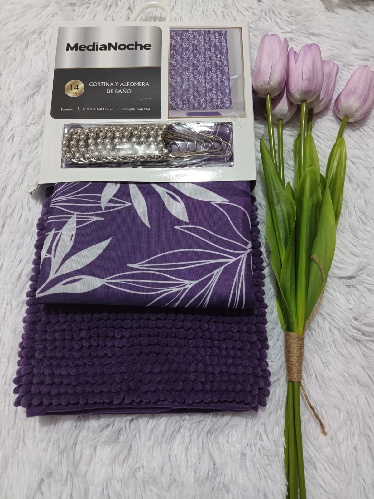 Cortina de baño de Tela Impermeable con diseño de hojas blancas, con fondo morado