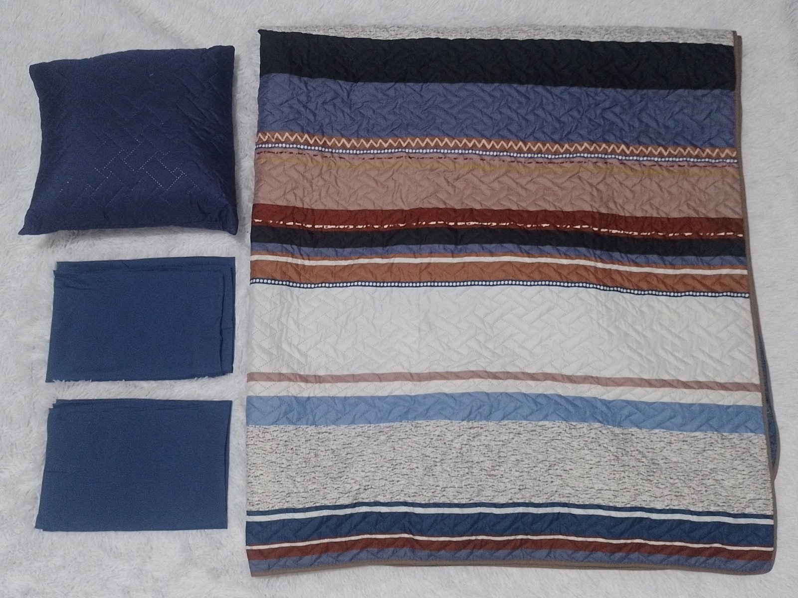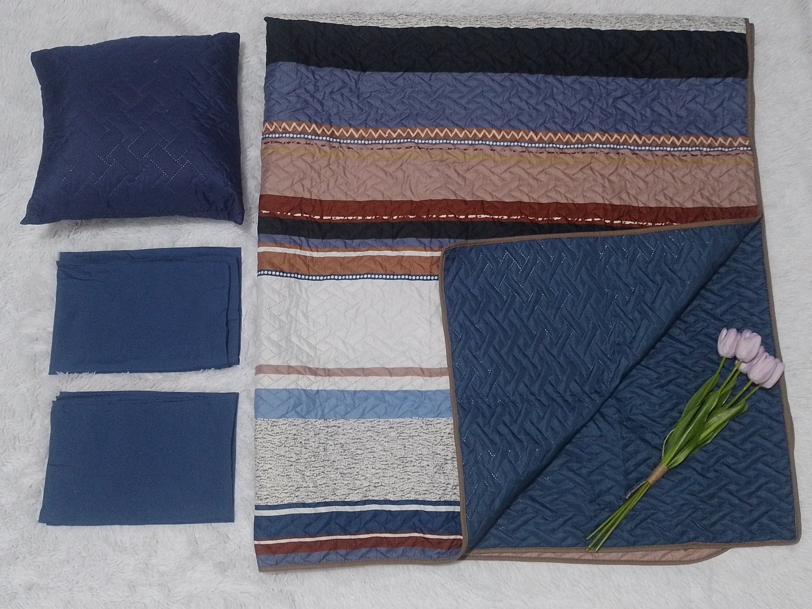 Cubrecama doble vista tamaño matrimonial, incluye 1 cubrecama, 2 fundas y 1 almohadón de 45cm x 45cm