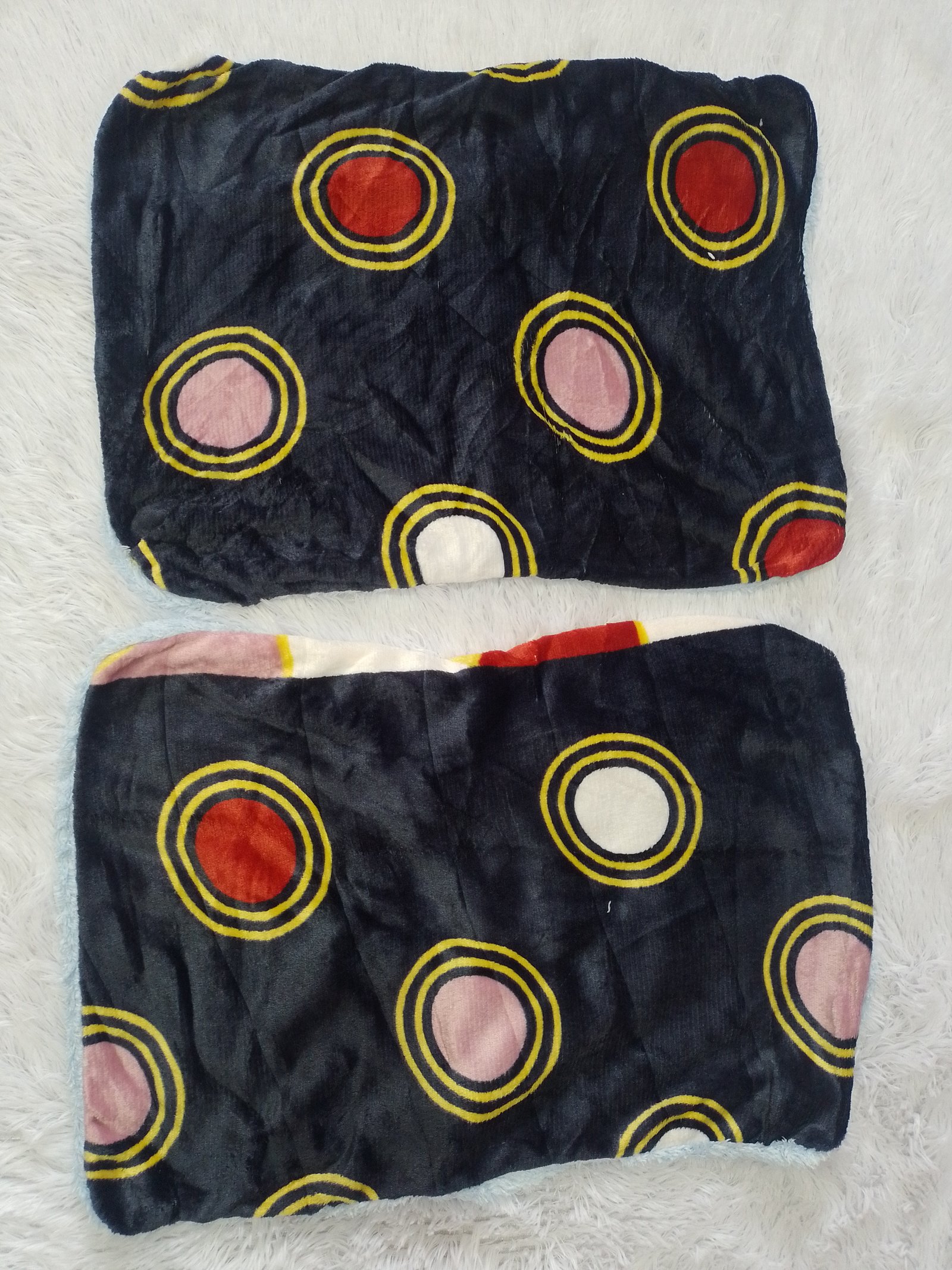 Edredón Enguatado Tamaño Queen - King Color Negro con circulos de colores y rombos, Incluye dos fundas En cama tamaño King queda sobre puesto En cama tamaño Queen queda con caida