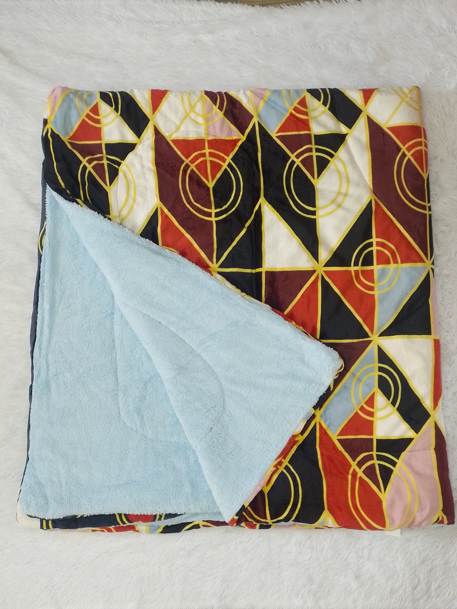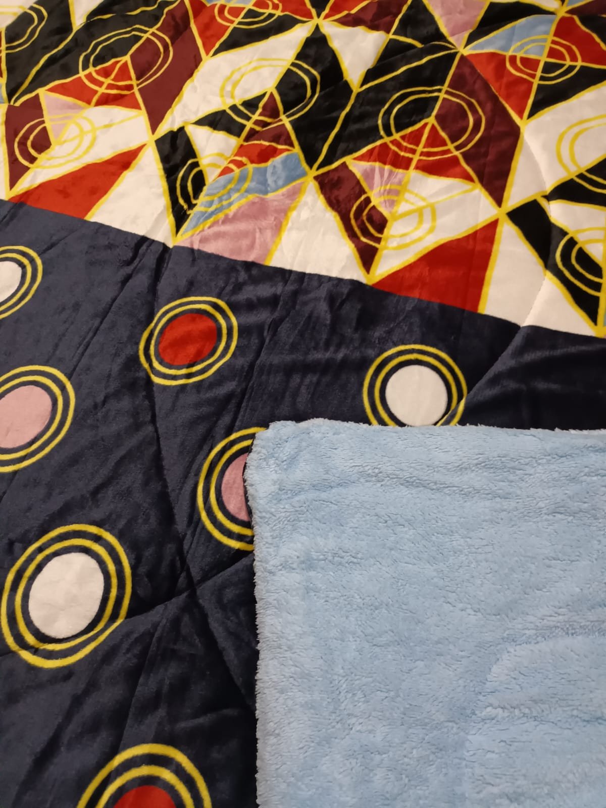 Edredón Enguatado Tamaño Queen - King Color Negro con circulos de colores y rombos