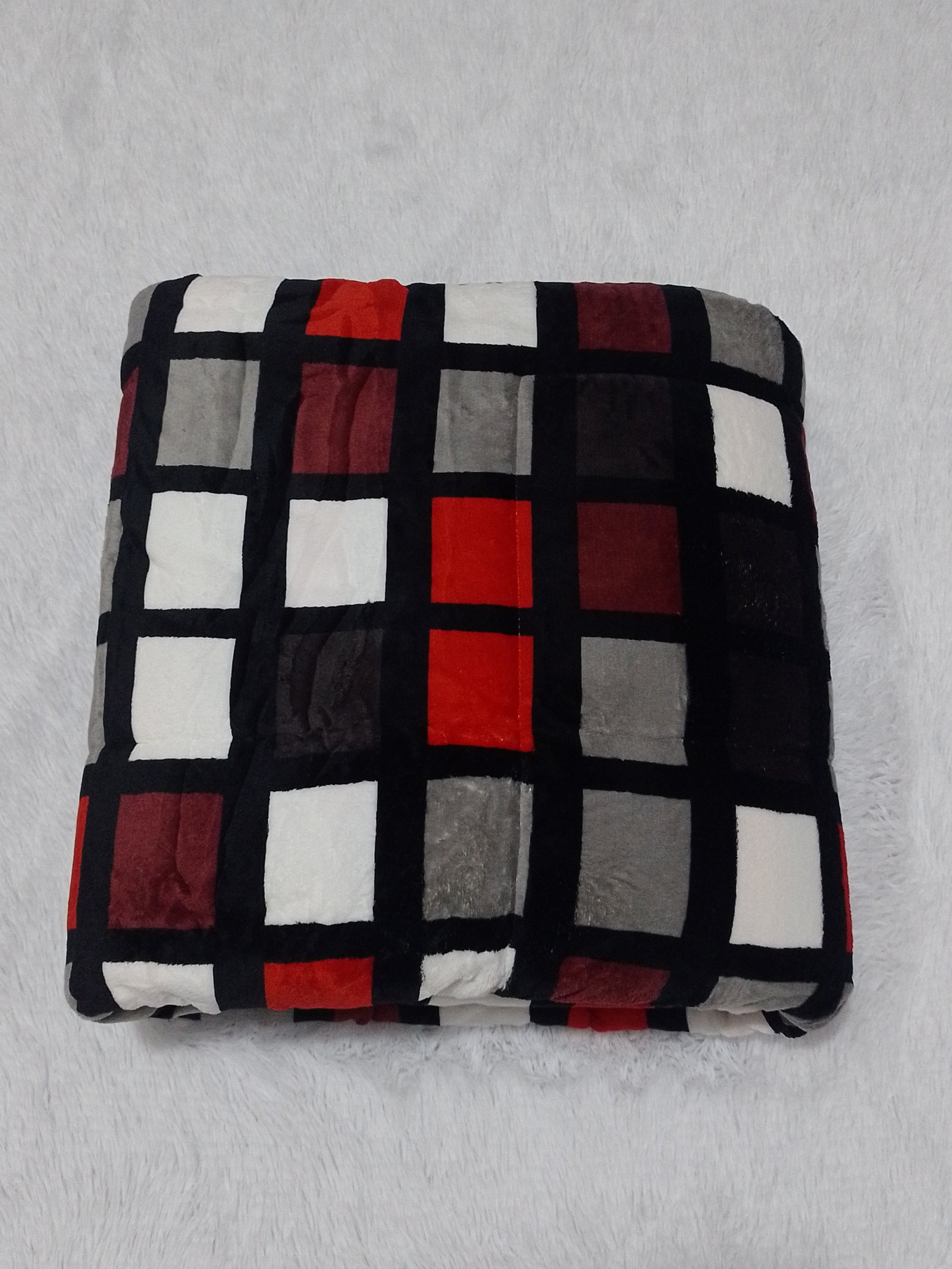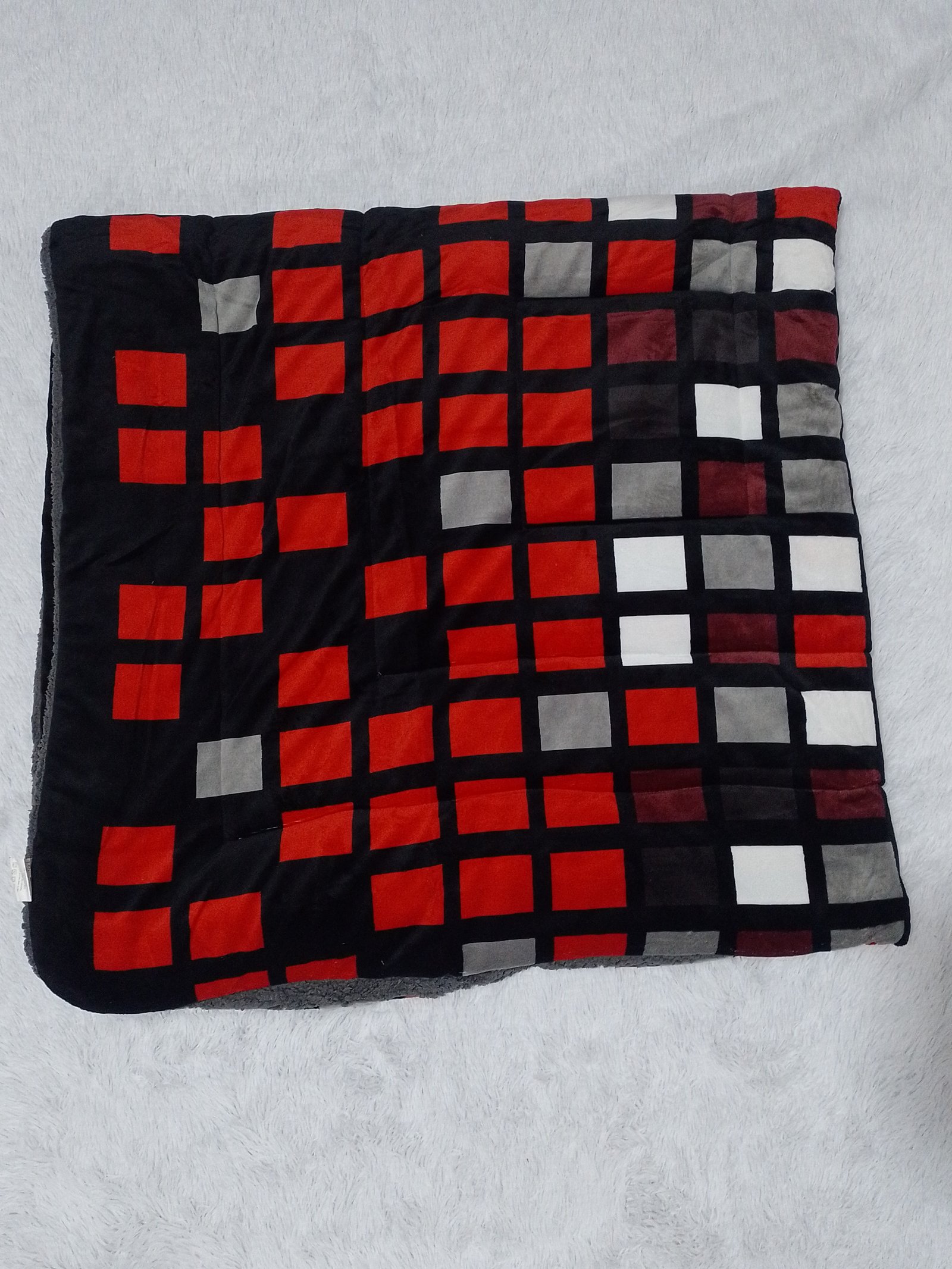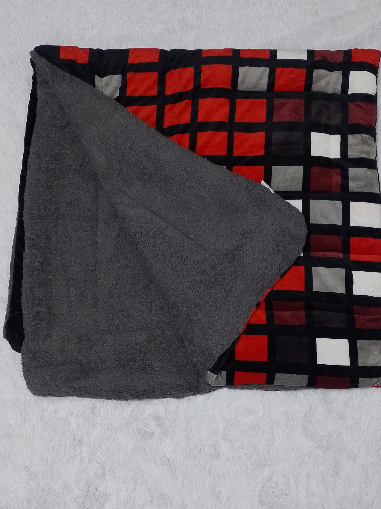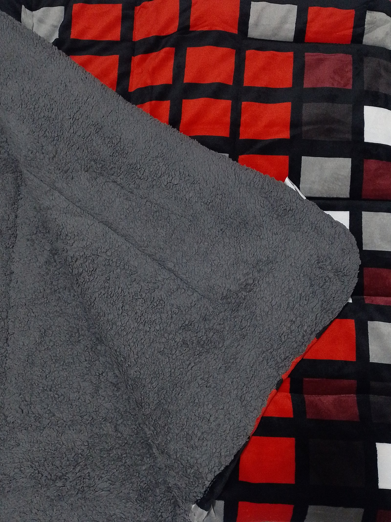 Edredón Tamaño Matrimonial color negro con cuadros rojos y grises, con un espesor de 2.5cm. No Incluye fundas