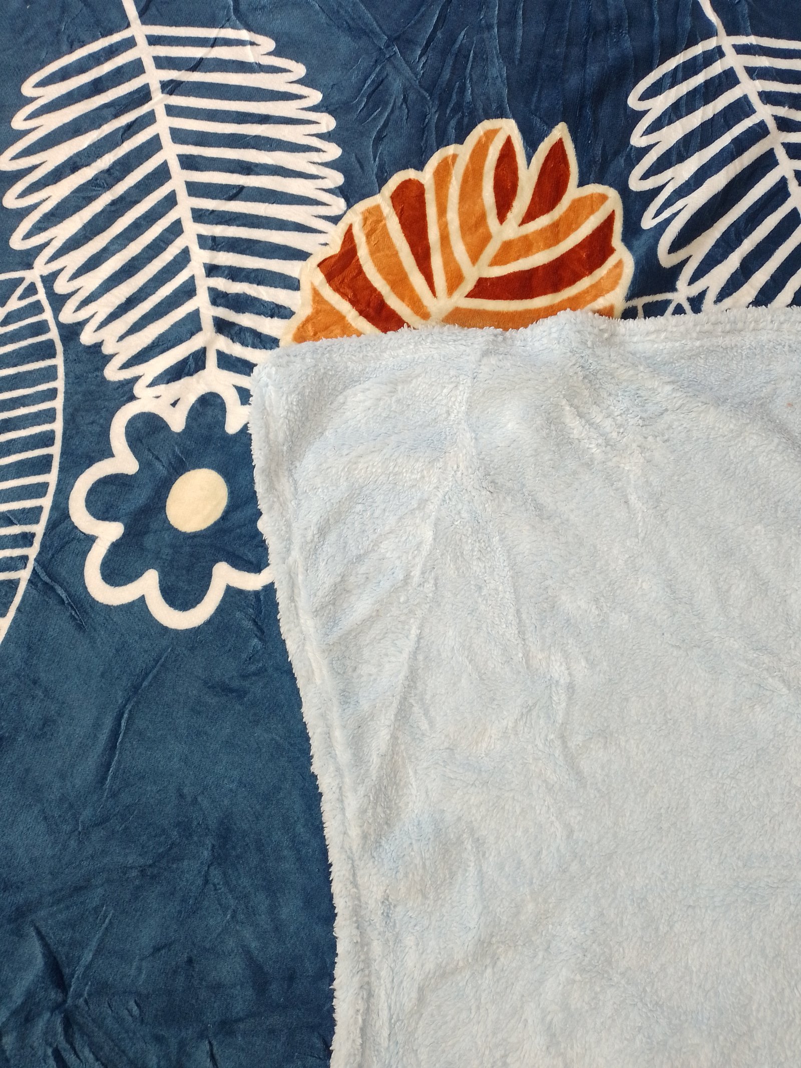 Ponchito tamaño matrimonial con borrego, color azul, diseño de hojas blancas y cafes