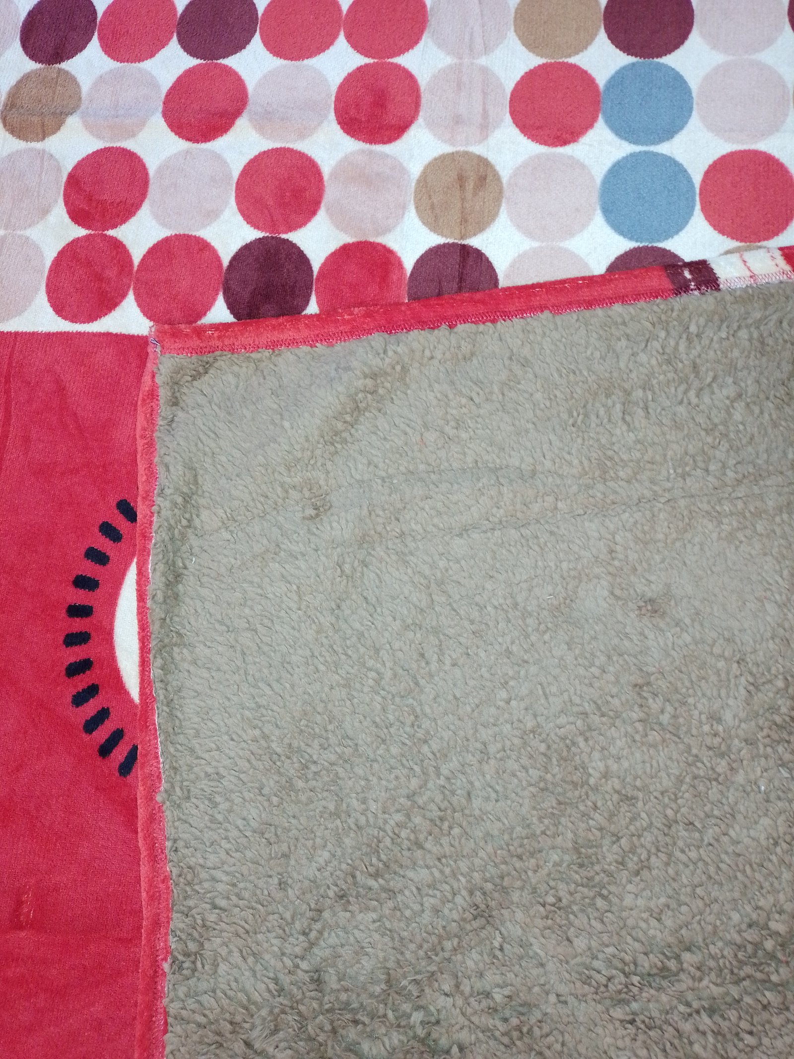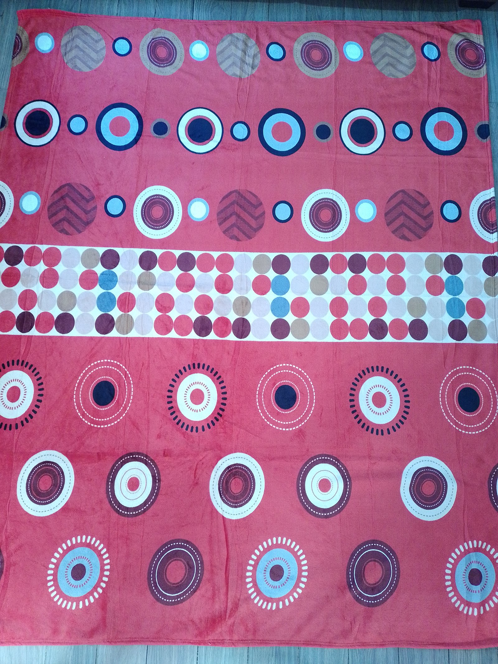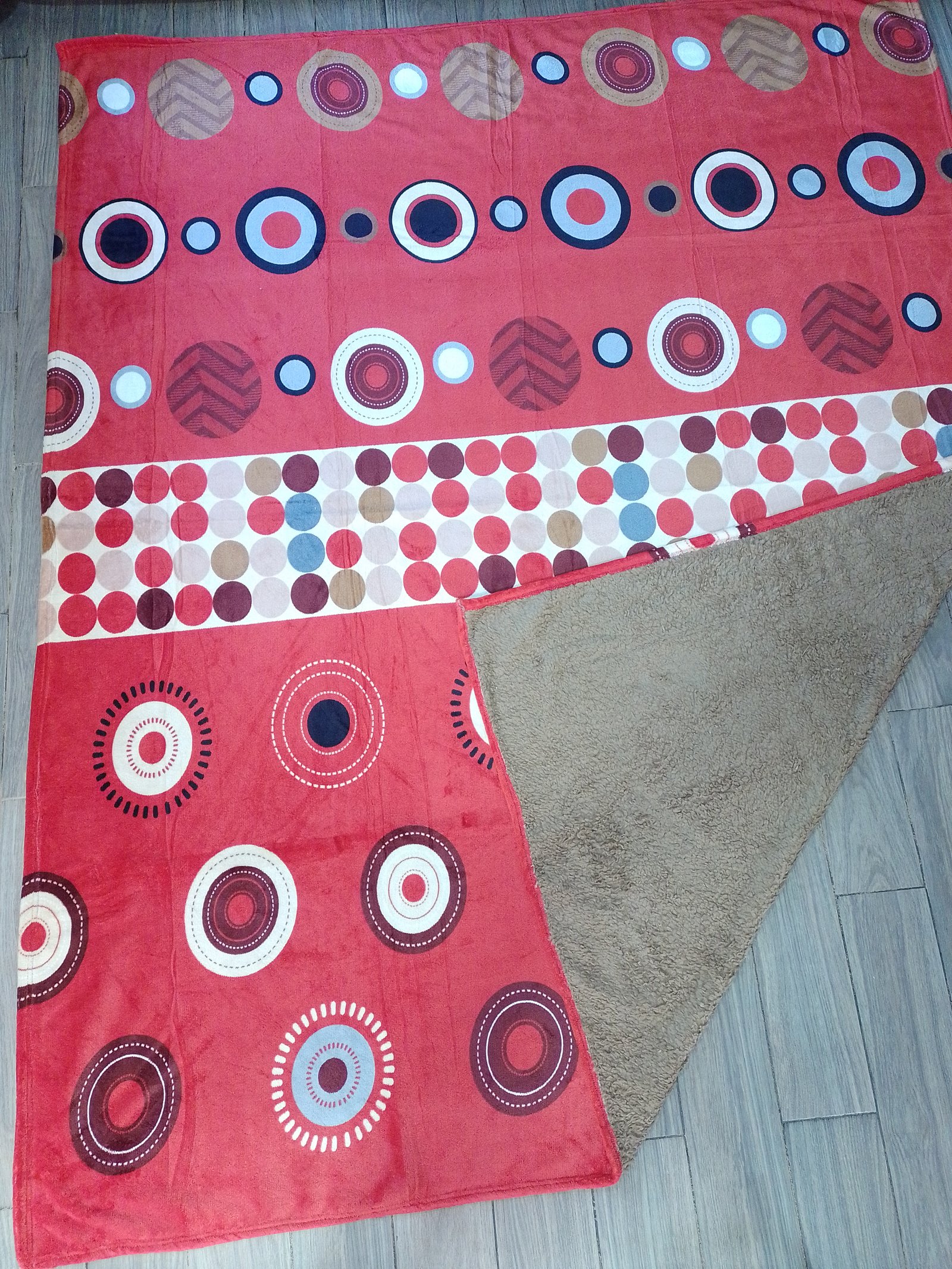 Ponchito tamaño matrimonial con borrego, color rojo y circulos de difentes tamaños