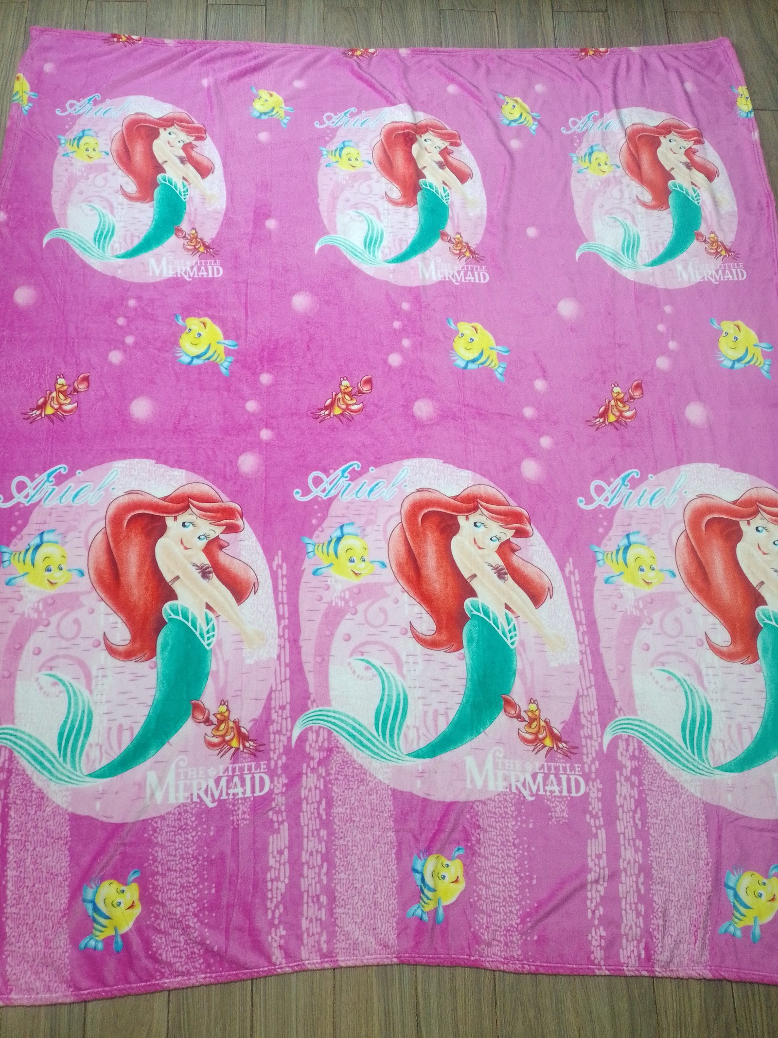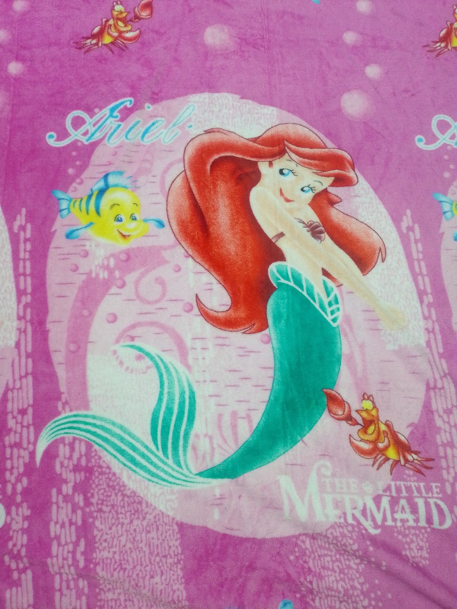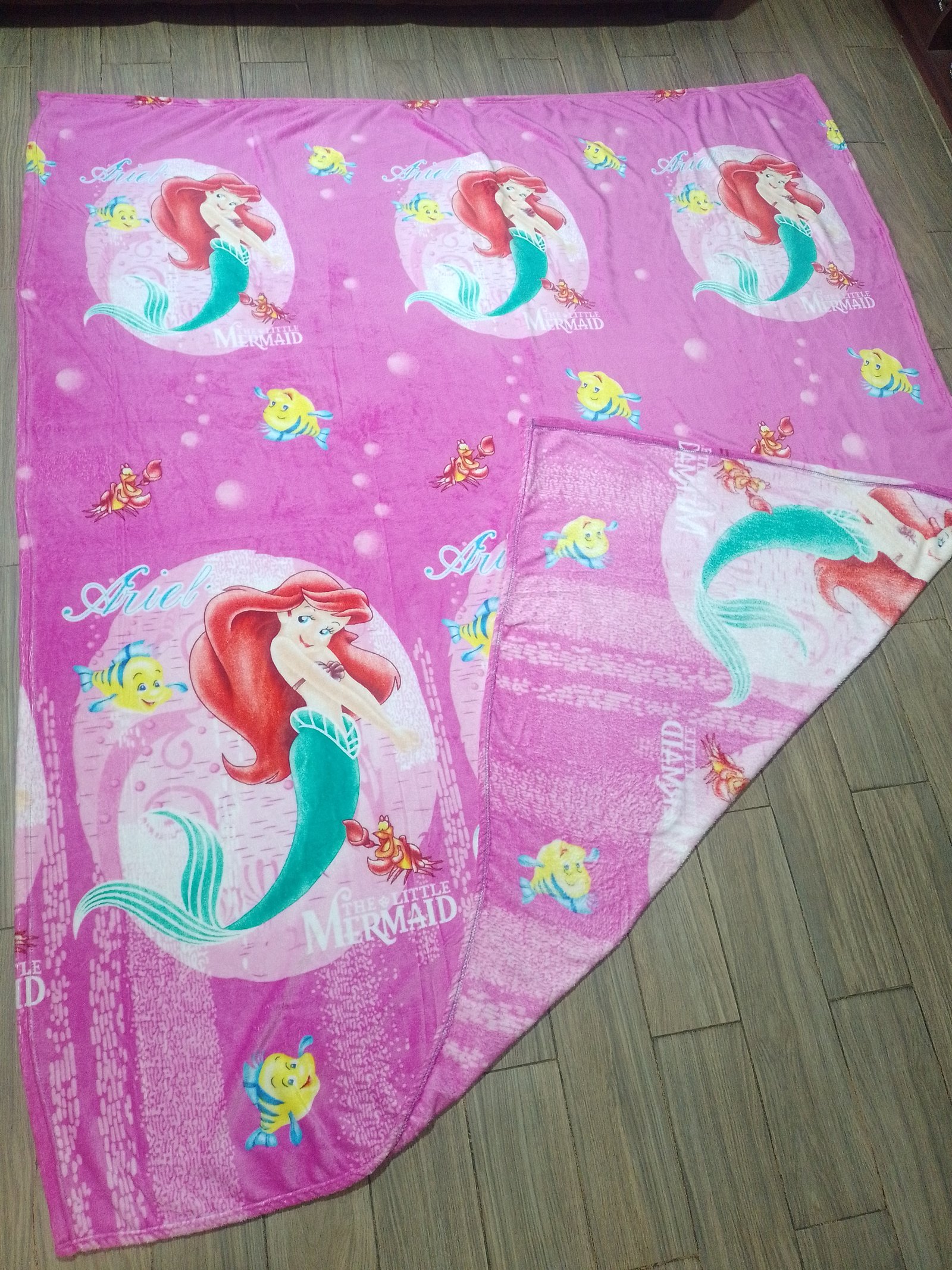 Ponchito Tamaño Matrimonial Sin Borrego, Tela Coral con Diseño de La Sirenita con fondo rosado