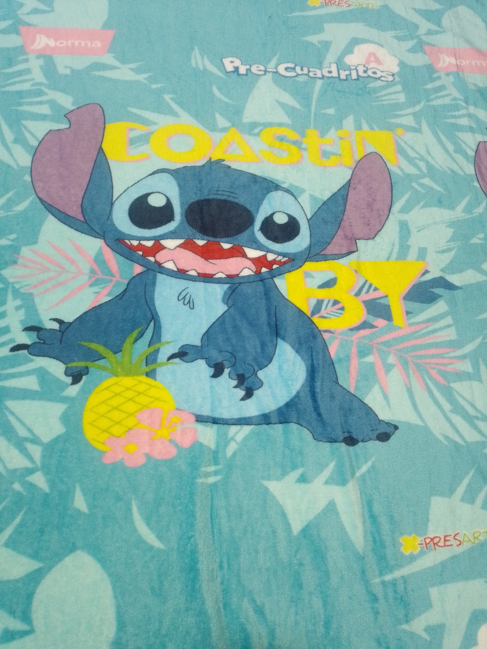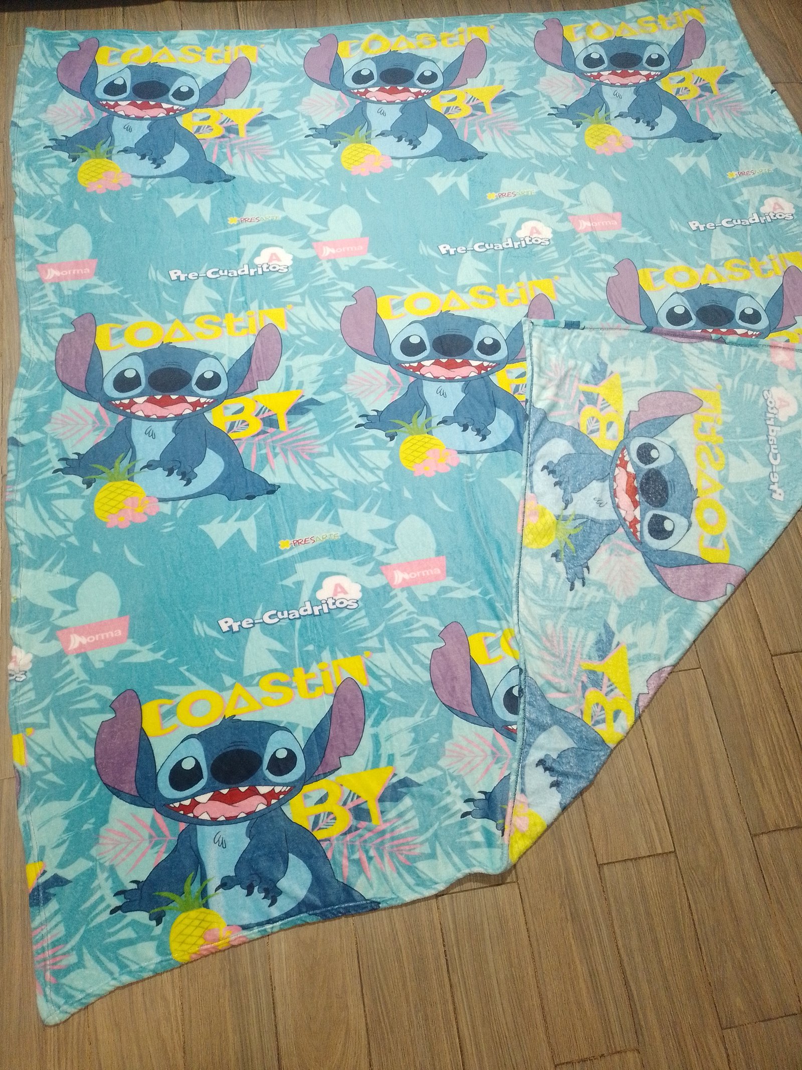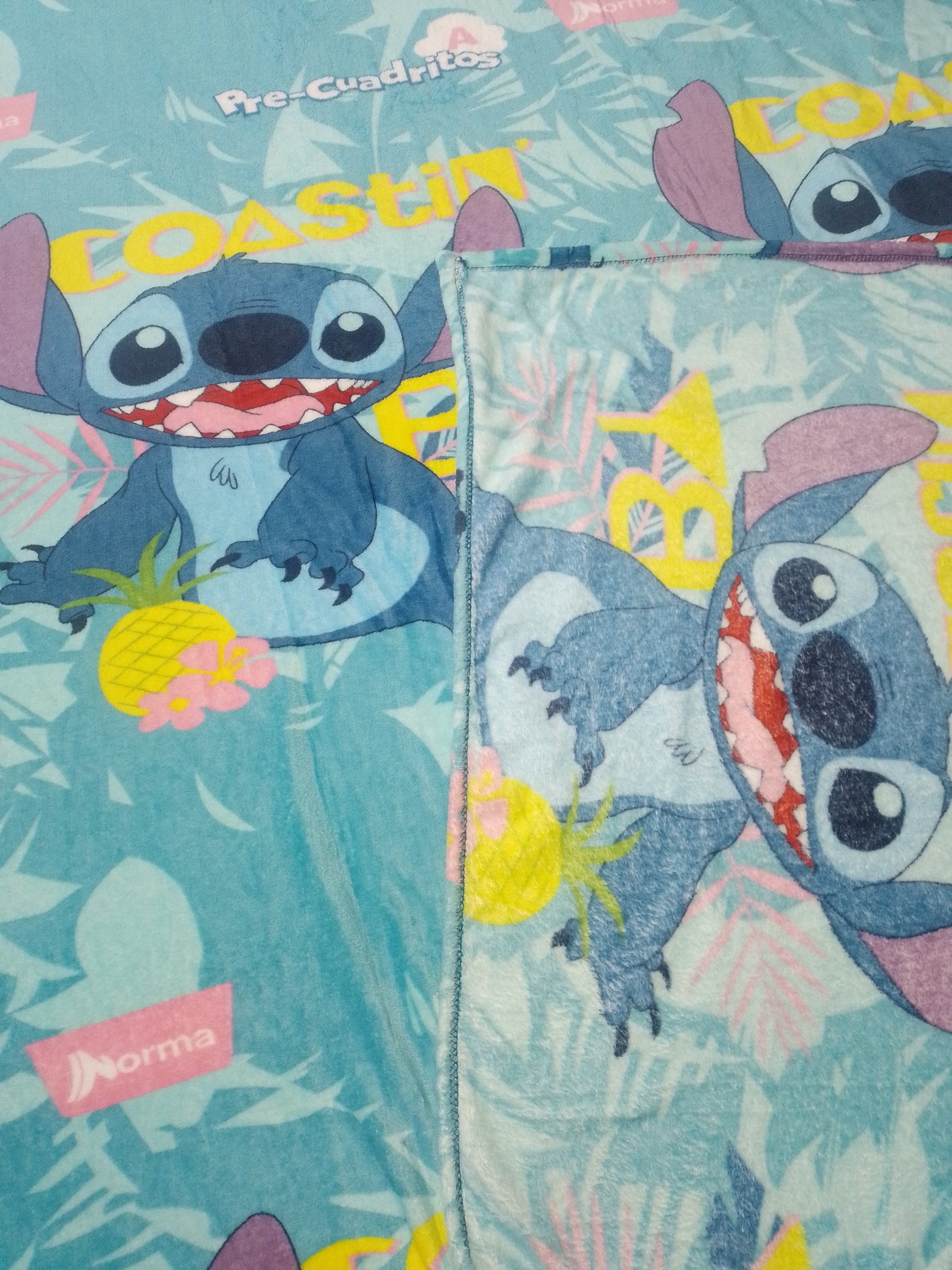 Ponchito Tamaño Matrimonial Sin Borrego, Tela Coral con Diseño de Stetch en la Playa fondo celeste