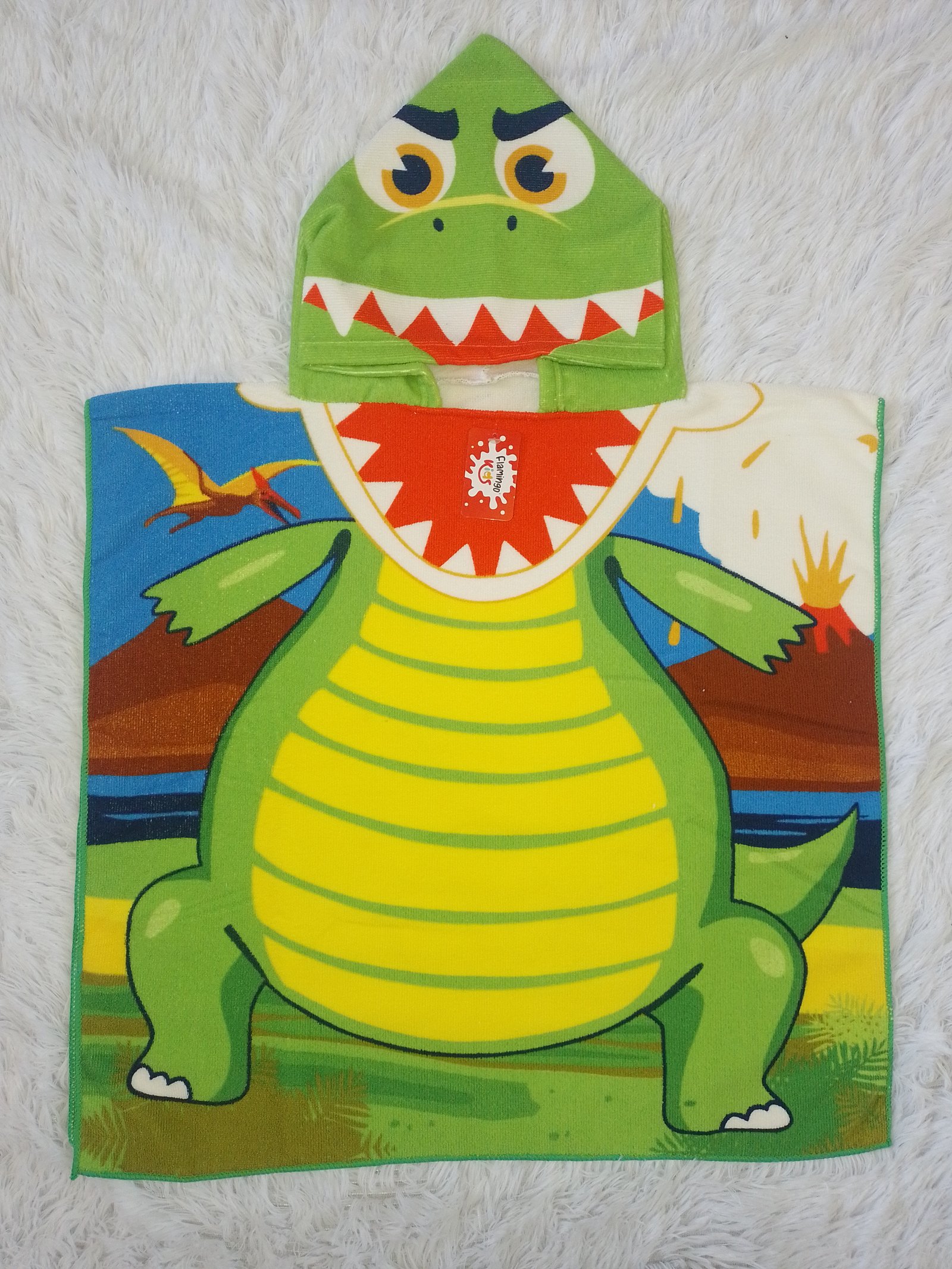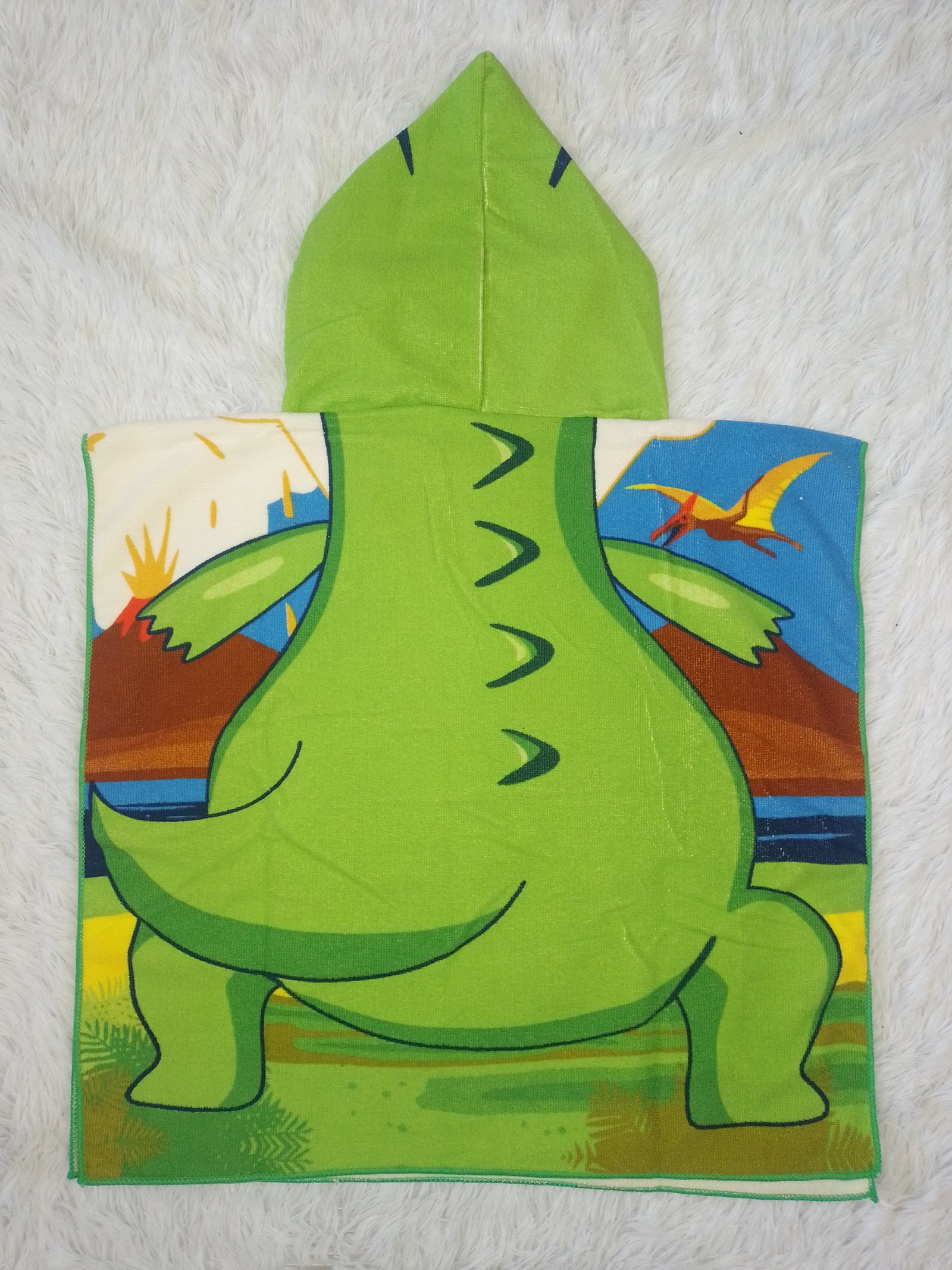 Salida de baño de microfibra para niños de dos a cinco años, con personaje de Dinosaurio Medidas de 90cm de largo por 60cm ancho
