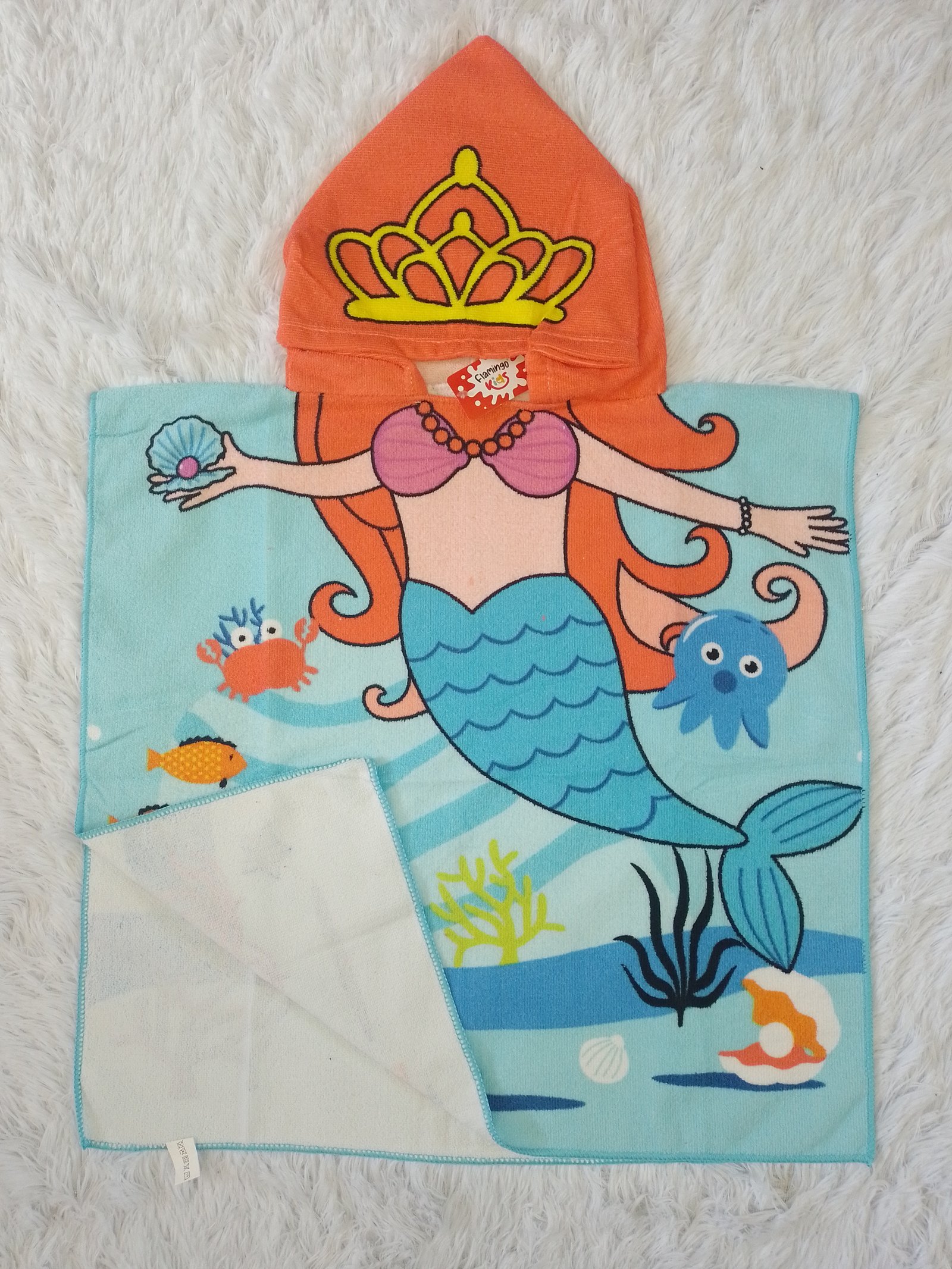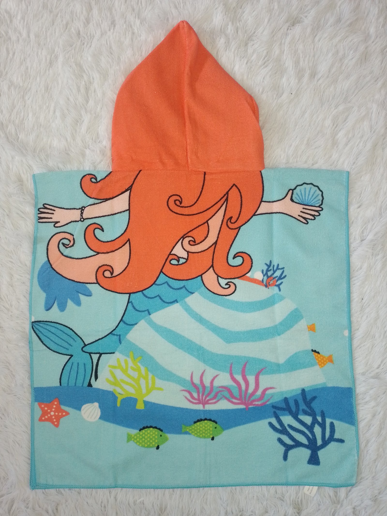 Salida de baño de microfibra, personaje de la Sirenita con gorro color anaranjado