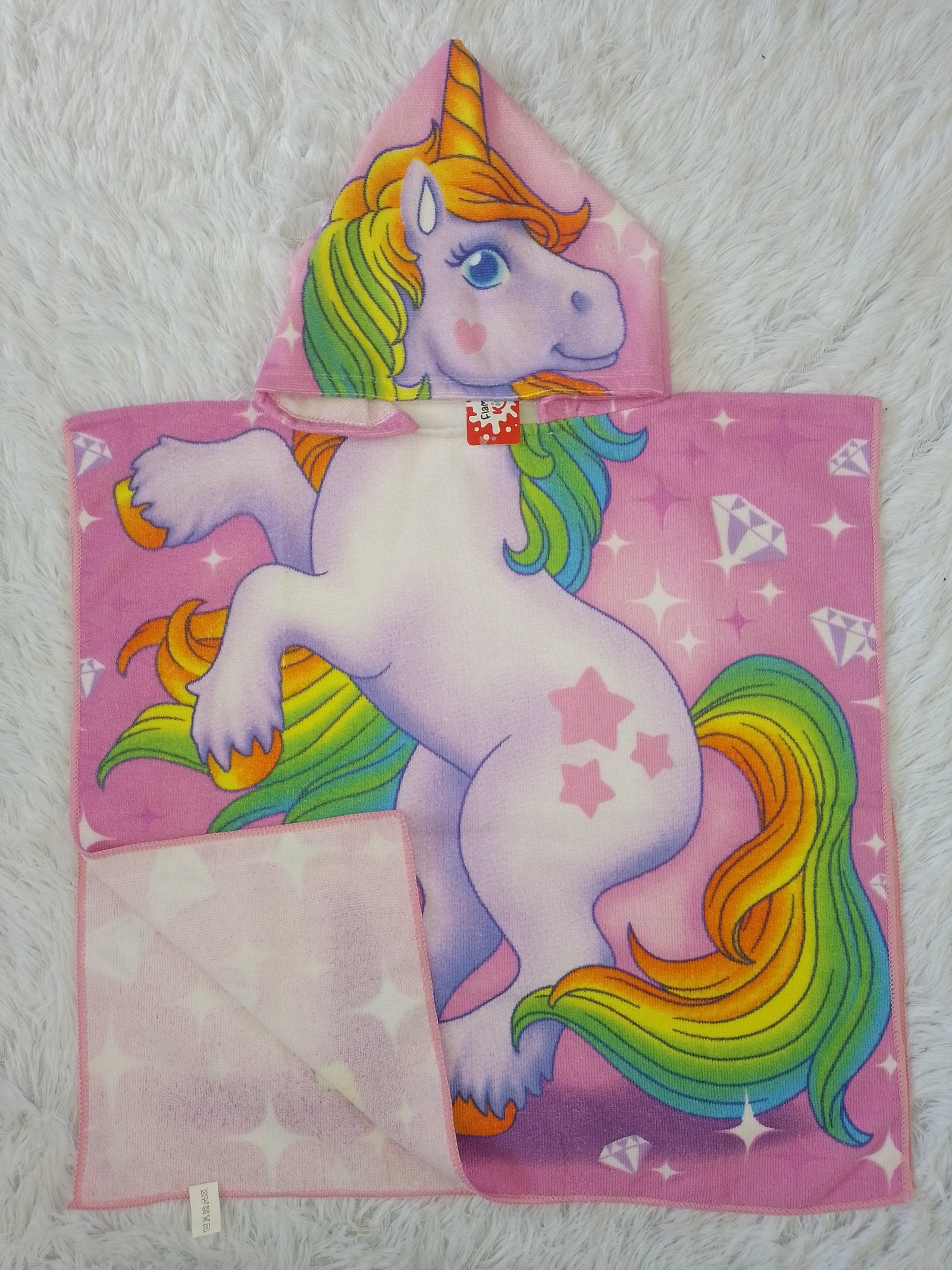 Salida de baño de microfibra para niñas de dos a cinco años , con personaje de Unicornio con fondo rosado Medidas de 90cm de largo por 60cm ancho