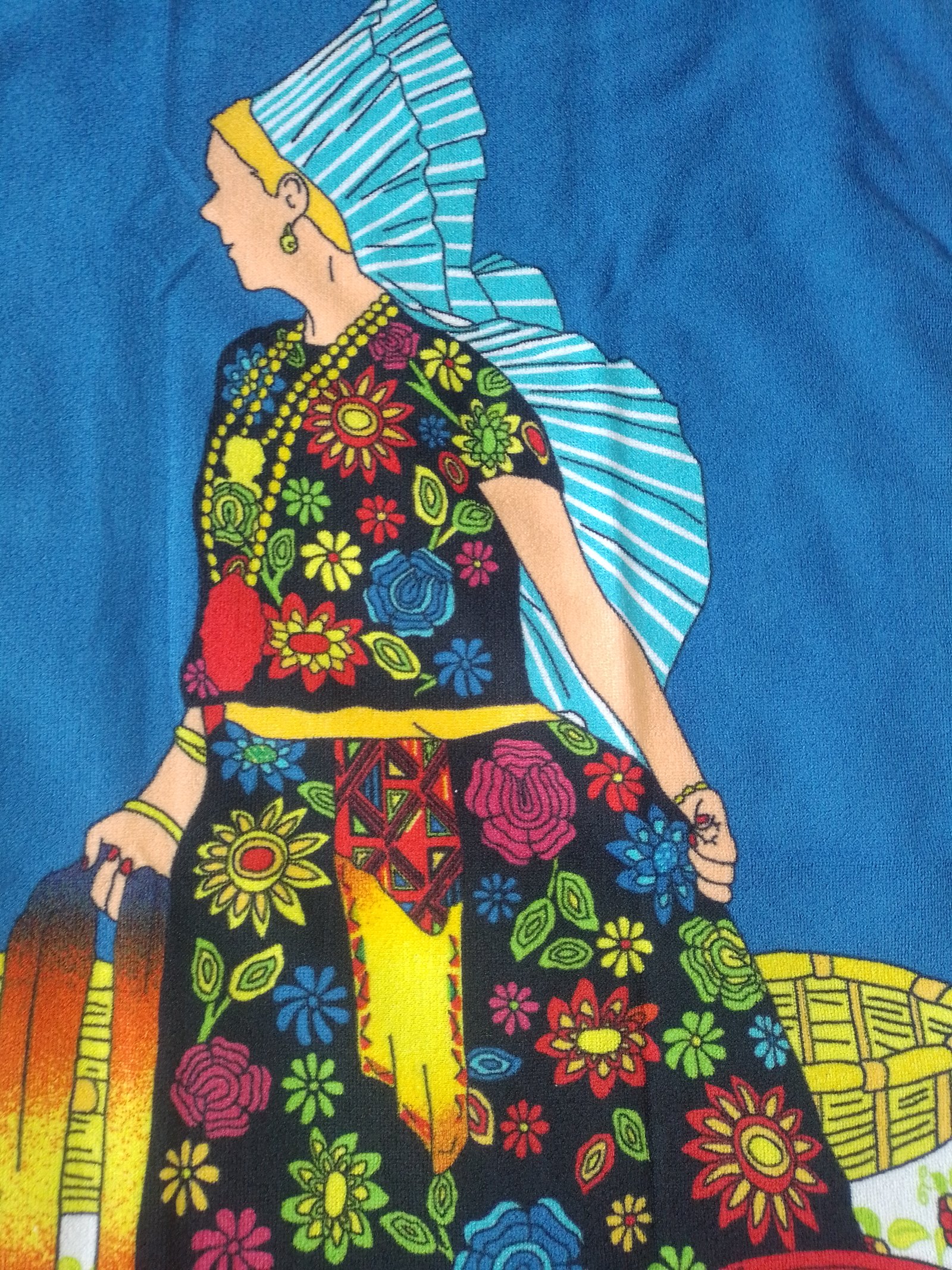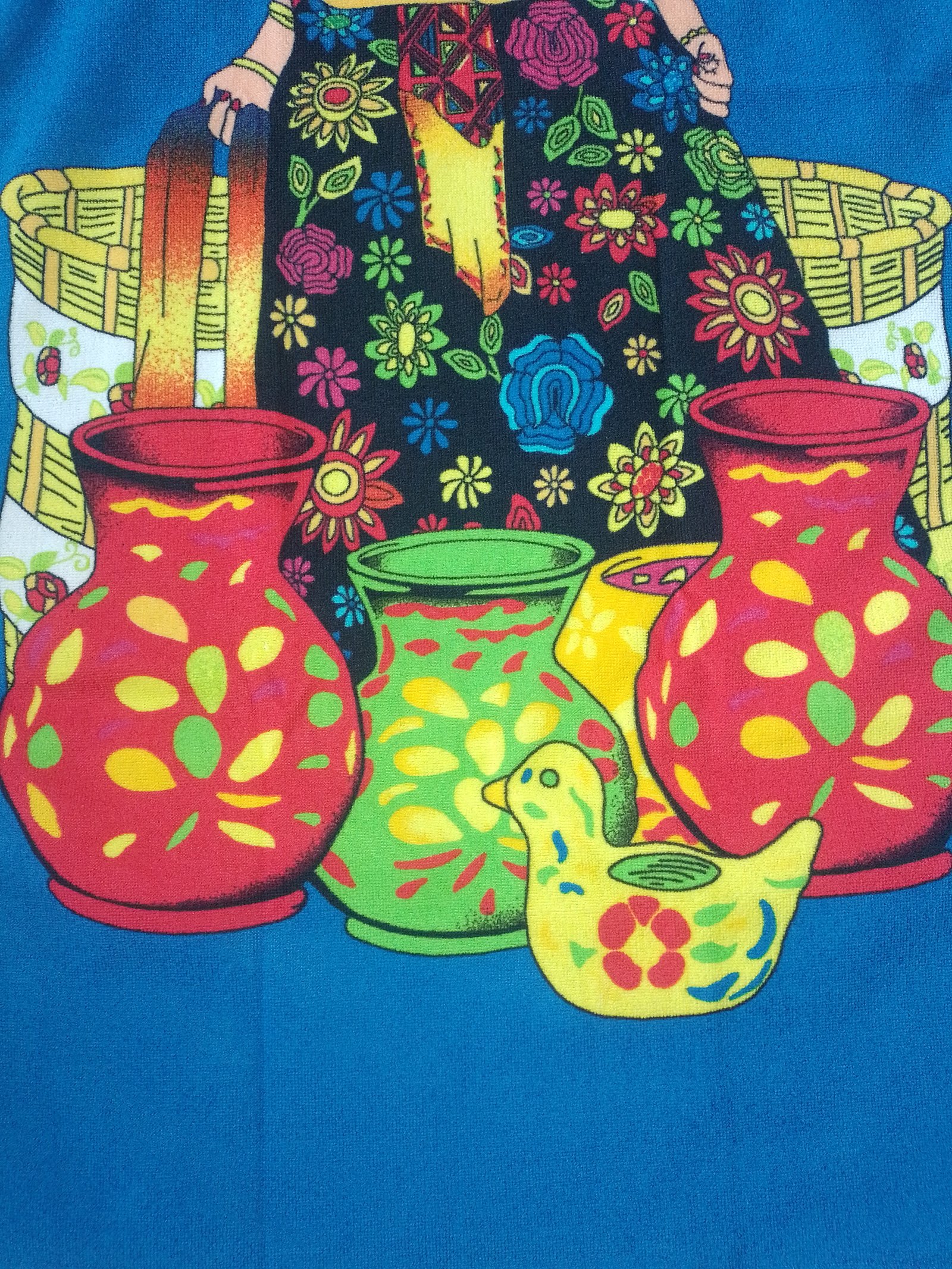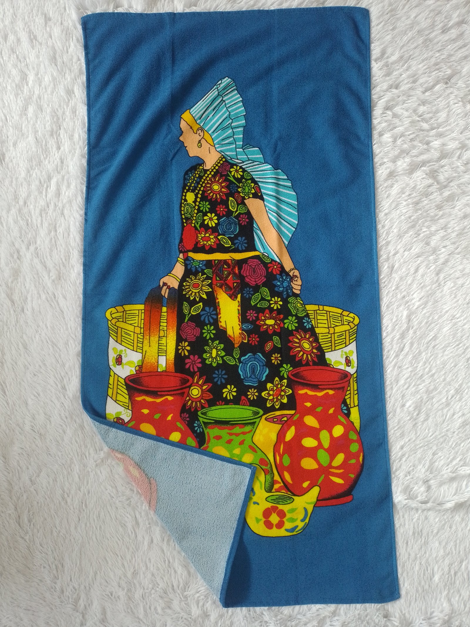 Toalla de microfibra con figura de una Persona y Tinajas fondo Azul Medidas de 140cm de largo y 70cm de ancho
