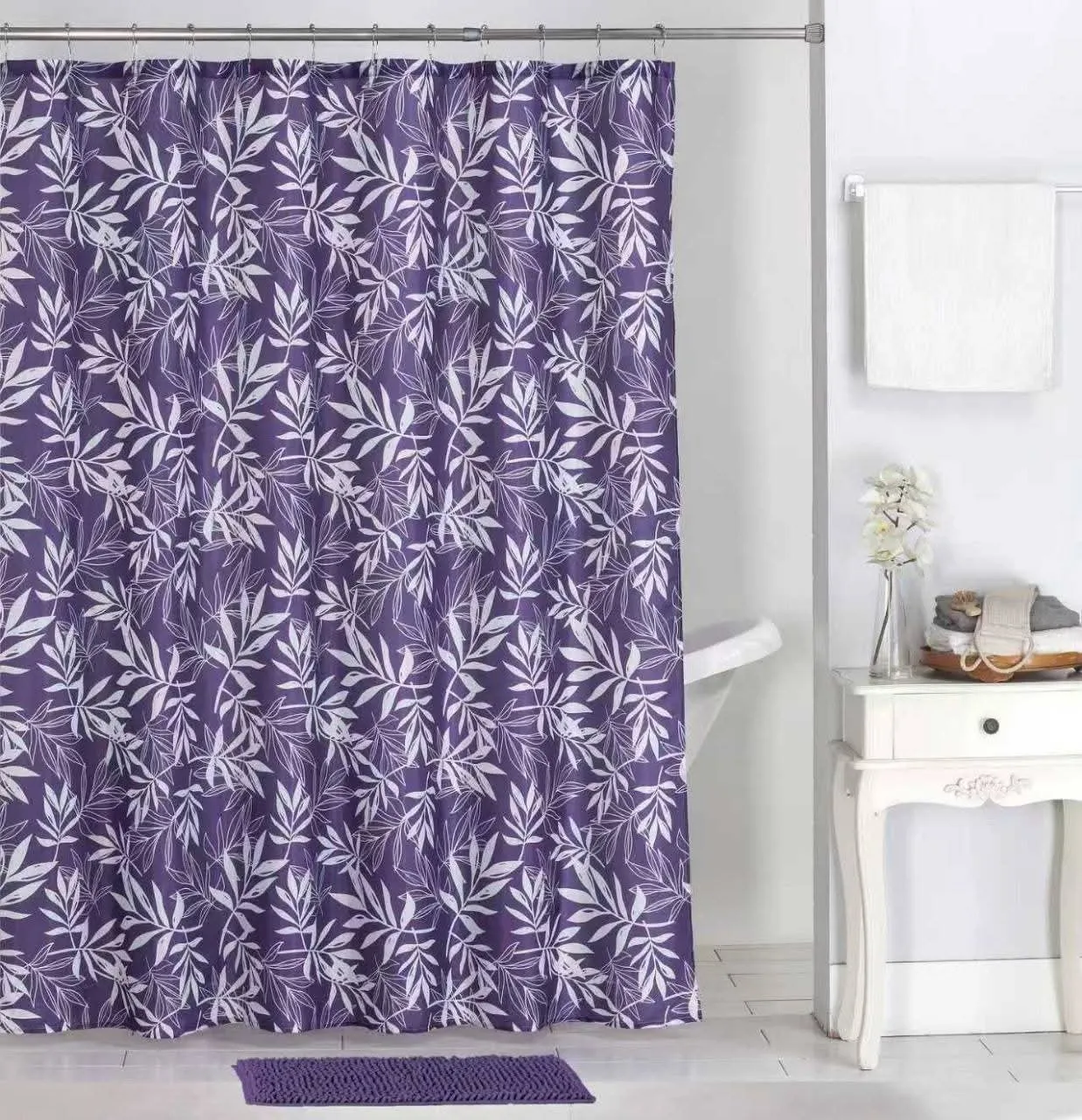 Cortina de baño de Tela Impermeable con diseño de hojas blancas, con fondo morado