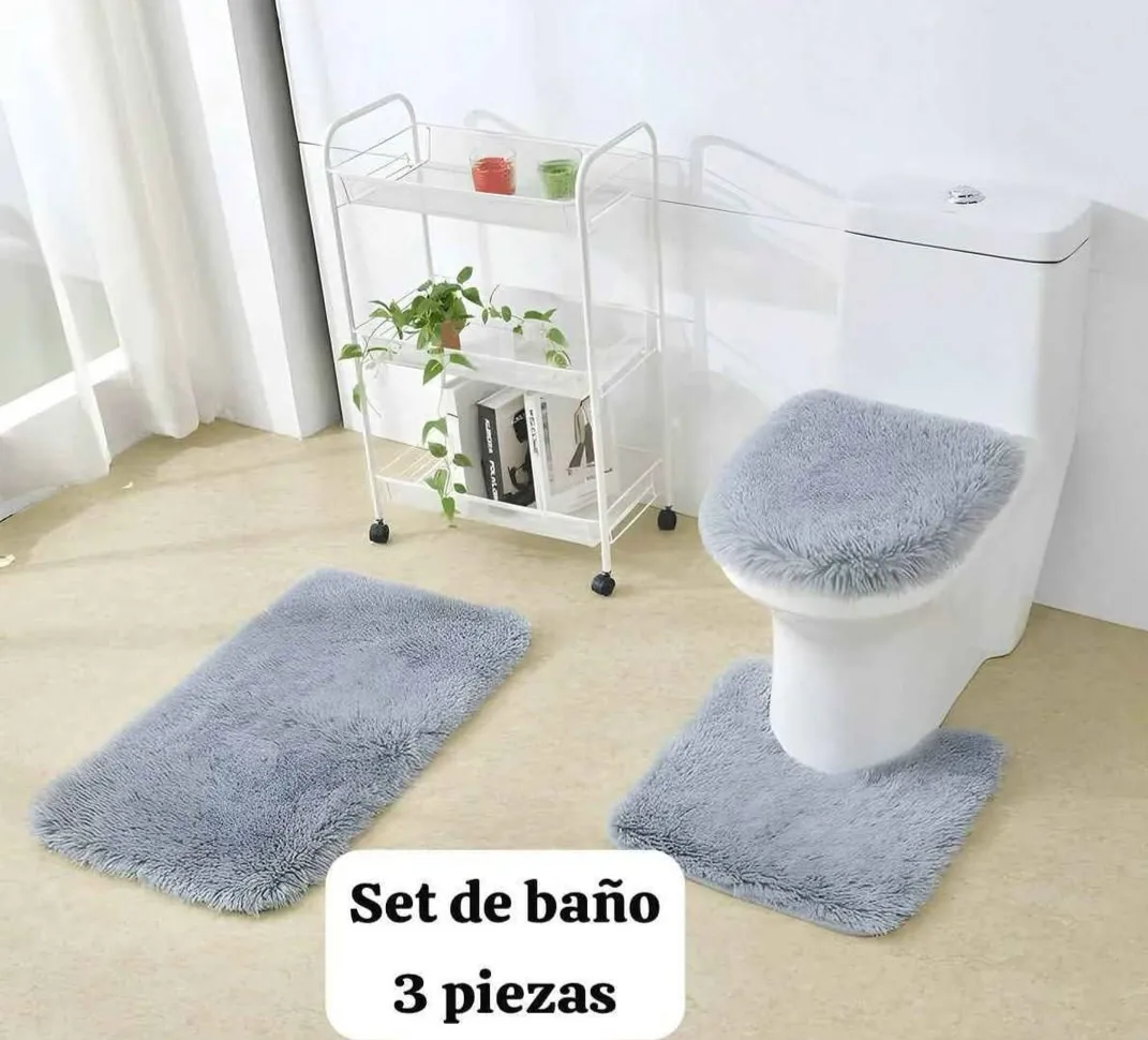 Set de Alfombras para baño con textura de Peluche. Incluye tres piezas, 1 cobertor tapa de baño, 1 pie de taza y 1 alfombra salida de baño