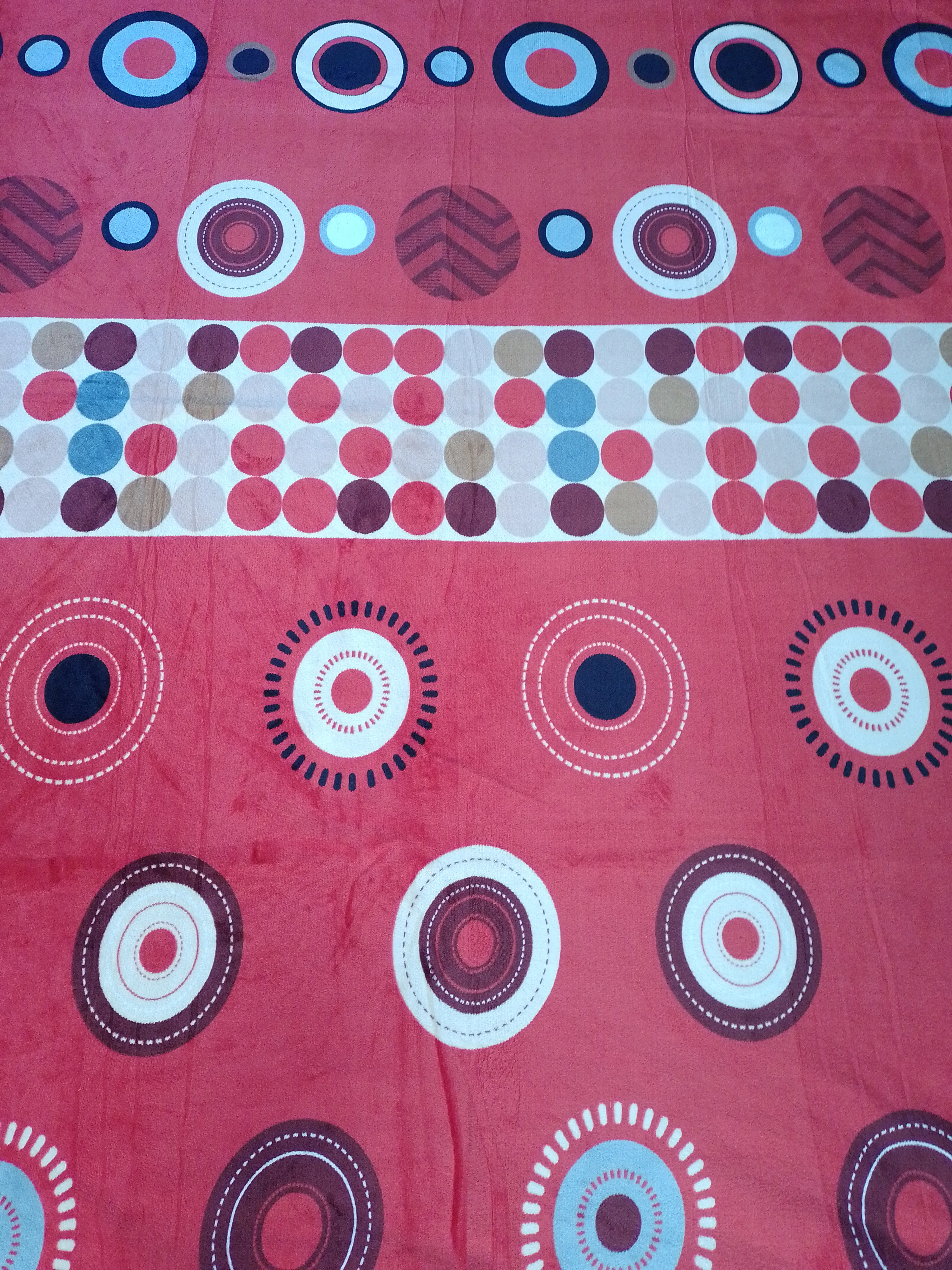 Ponchito tamaño matrimonial con borrego, color rojo y circulos de difentes tamaños