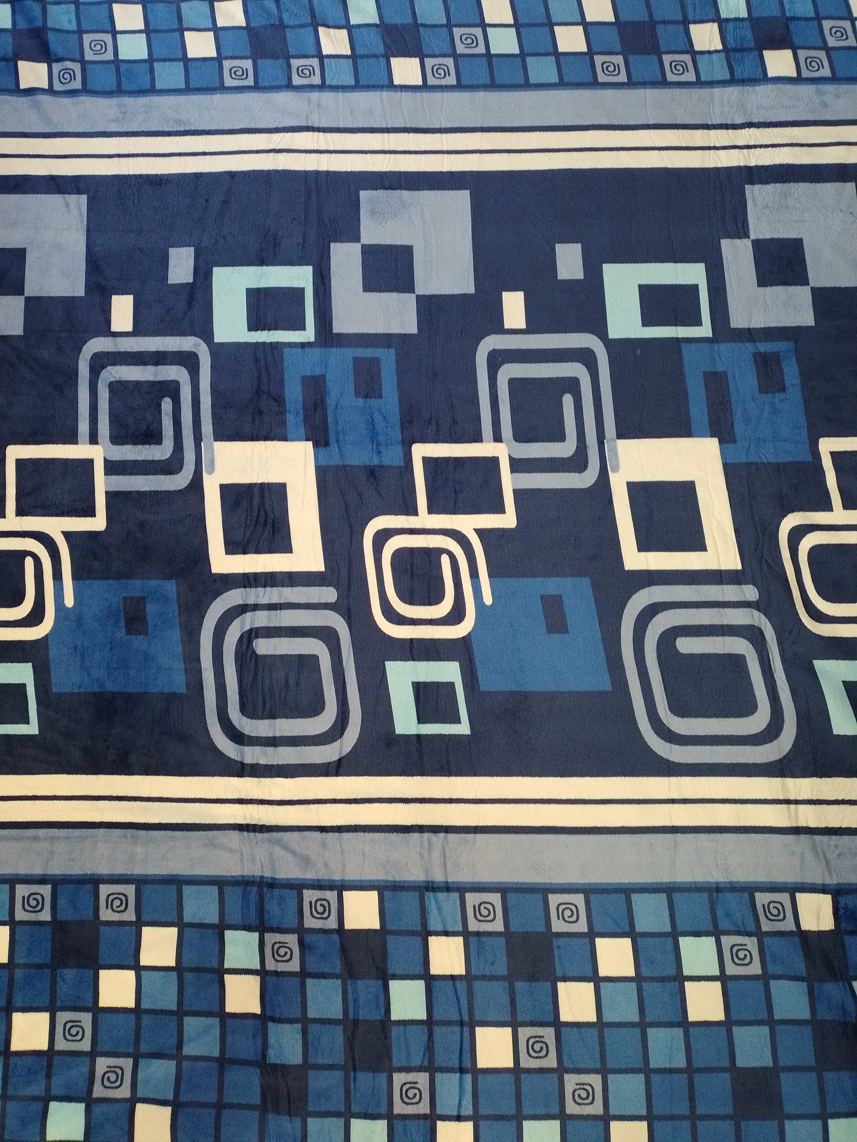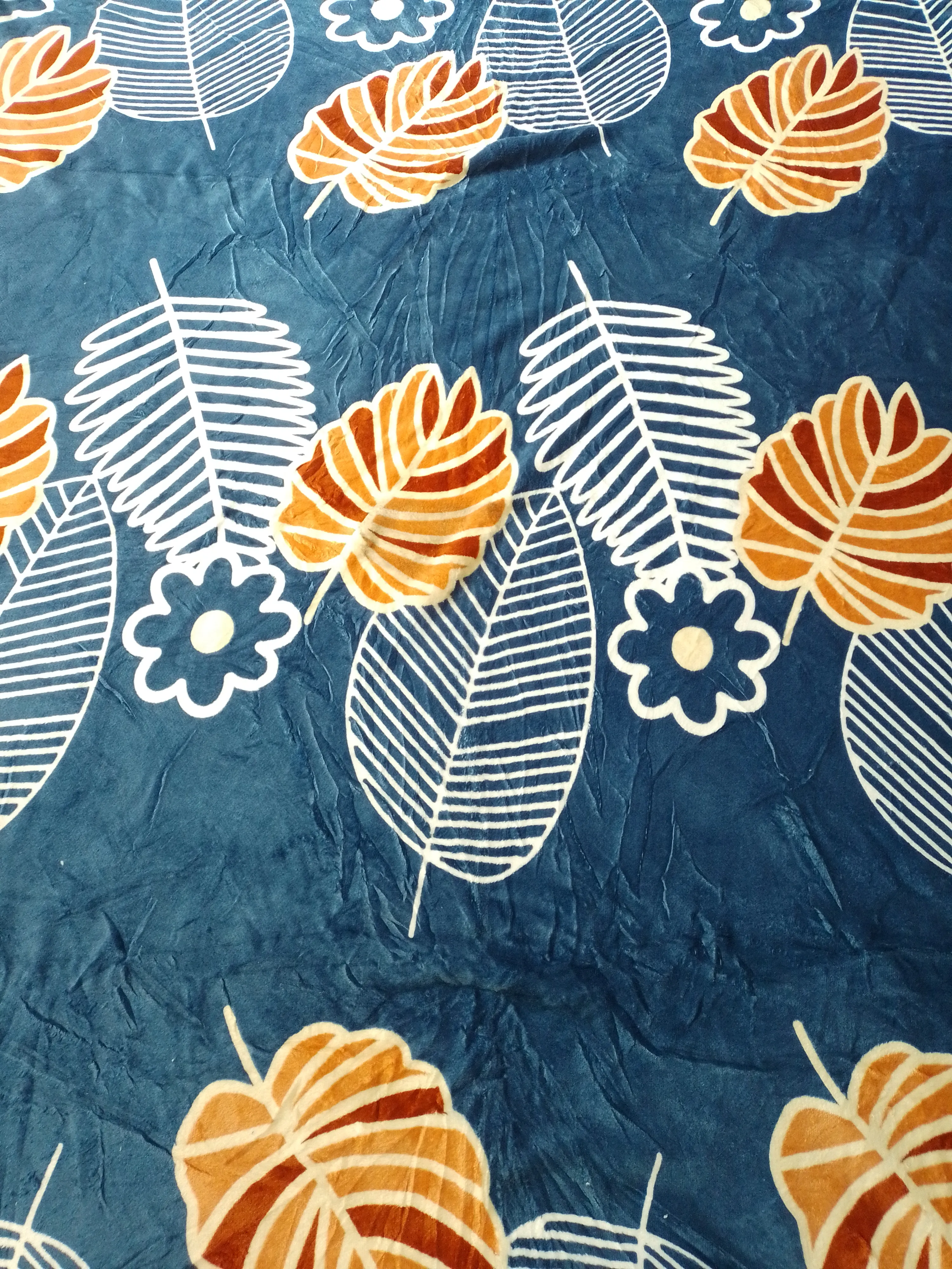 Ponchito tamaño matrimonial con borrego, color azul, diseño de hojas blancas y cafes