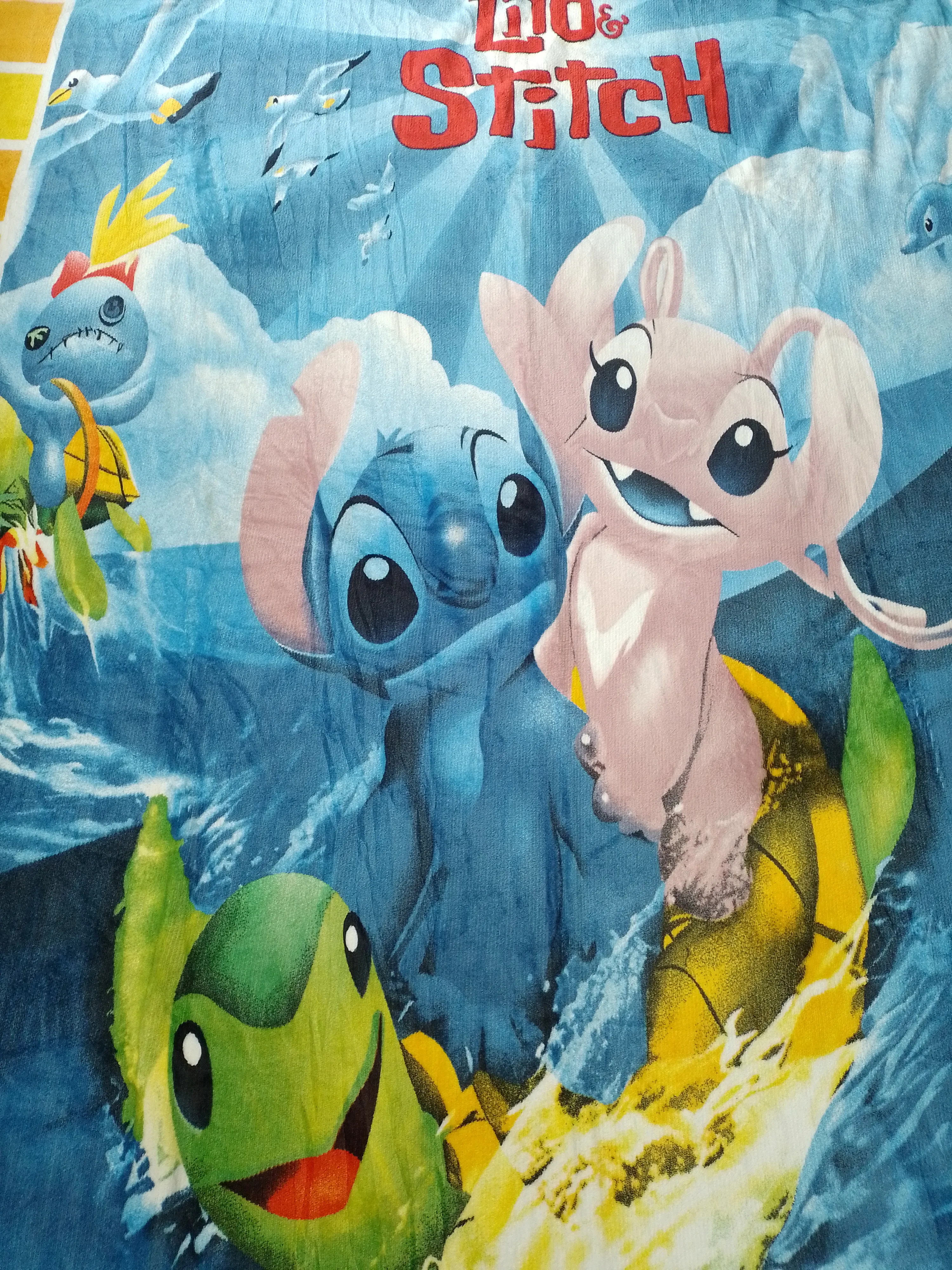 Ponchito tamaño Matrimonial con borrego, diseño de Stetch y Angel sobre una Tortuga, fondo Azul