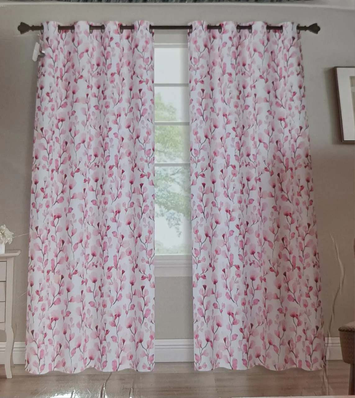 Cortina Black out de flores color rosa, con fondo blanco